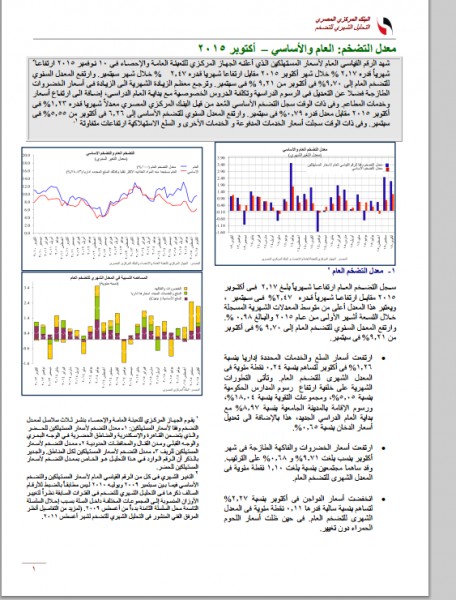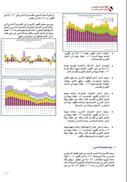 وقد سجل التضخم الأساسي المعد من قبل البنك المركزى المصرى معدلا شهريا قدره 1.23% في أكتوبر الماضي مقابل 0.79% خلال شهر سبتمبر، وارتفع المعدل السنوى للتضخم الأساسى نحو 6.26% في أكتوبر مقابل 5.5%خلال شهر سبتمبر.