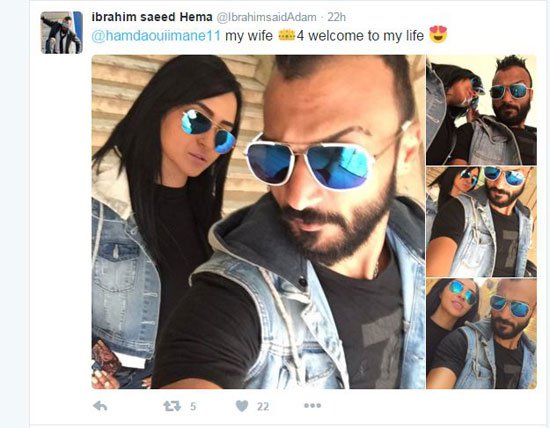 ومن جانبها نشرت زوجته الجديدة إيمان حمودى من المغرب، صورة برفقة زوجها إبراهيم سعيد على حسابها على تويتر وعلقت قائلة "زوجى حياتى". وبمجرد نشر الصور انهالت تعليقات المدونين على حسابين إبراهيم وزوجته، مهنئينهما بالزوج، متمنين لهما السعادة فى حياتهما الزوجية الجديدة.