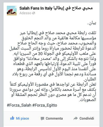 تلقت رابطة محبى ومشجعى محمد صلاح بإيطاليا دعوة رسمية من صلاح غالى والد محمد صلاح وذلك لحضور مباراة روما وإنتر ميلان من مقصورة إستاد الأوليمبيكو السبت المقبل .