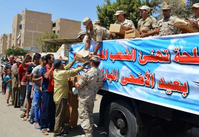 تنفيذا لتوجيهات الرئيس عبد الفتاح السيسي رئيس الجمهورية القائد الاعلي للقوات المسلحة بتخفيف العبئ عن كاهل المواطنين بالمناطق الاكثر احتياجا علي مستوي الجمهورية ، اصدر الفريق اول صدقي صبحي القائد العام للقوات المسلحة وزير الدفاع والانتاج الحربي اوامرة بقيام جهاز الخدمات العامة بالتعاون مع جهاز مشروعات الخدمة الوطنية وهيئة الامداد والتموين بإعداد وتجهيز مليون ونصف حصة غذائية وتوزيعها علي المستحقين من الفئات الاكثر احتياجا بالقري والنجوع والاحياء والمناطق الاكثر فقرا بالعديد من محافظات الجمهورية وذلك بنطاق الجيوش الميدانية والمناطق العسكرية بالتنسيق مديريات التضامن الاجتماعي والجمعيات الاهلية التي تدخل في نطاق مسئوليتها بمناسبة حلول عيد الأضحى المبارك .