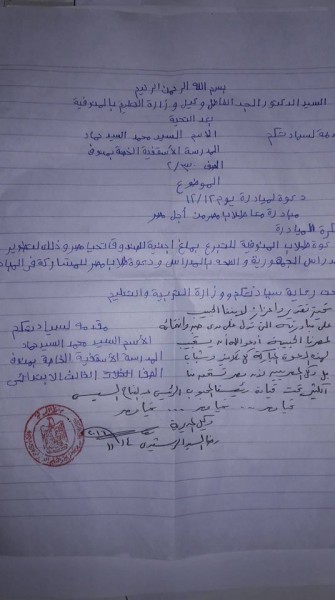 استقبل اليوم الدكتور عبدالله عمارة وكيل وزارة التربية والتعليم بالمنوفية والاستاذ رضا الرشيدي وكيل المديرية والاستاذ عبدالعزيز محفوظ مدير التعليم الخاص بمديرية التربية والتعليم بالمنوفية كل من الاستاذ سعيد عرفة مدير ادارة منوف التعليمة والطالب السيد محمد حماد الطالب بمدرسة الاسقفية الخاصة بمنوف صاحب مبادرة معا طلاب مصر من اجل مصر يوم 12/12 ردا علي دعوات جماعة الاخوان المسلمين وفشلهم في يوم 11/11. ويروي الطفل فكرة المبادرة انه يدعو كل طلاب مصر يوم 12 / 12 للتبرع بمبلغ 1 جنية لصندوق تحيا مصر ايمانا منهم بدور سيادة الرئيس عبدالفتاح السيسي في حماية مصر وخدمة مصر وشعبها وتطوير العملية التعليمة وقد رحب الدكتور عبدالله عمارة بالفكرة والمبادرة واستقبل الطالب بحفاوة بالغة النظير وقد وعد سيادتة بتنفيذ المبادرة ووعد بابلاغ وزير التربية والتعليم وتنفيذ المبادرة في كل مدراس الجمهورية
