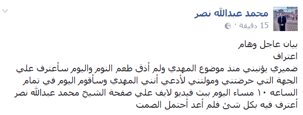 وقال "نصر"، عبر صفحته الشخصية بموقع التواصل الاجتماعي "فيس بوك"، اليوم السبت: "بيان عاجل وهام، اعتراف ضميري يؤنبني منذ موضوع المهدي ولم أذق طعم النوم، واليوم سأعترف على الجهة التي حرضتني ومولتني لأدعي أنني المهدي، وسأبث اليوم في تمام الساعة ١٠ مساء فيديو لايف على صفحة الشيخ محمد عبد الله نصر، أعترف فيه بكل شيء فلم أعد أحتمل الصمت".