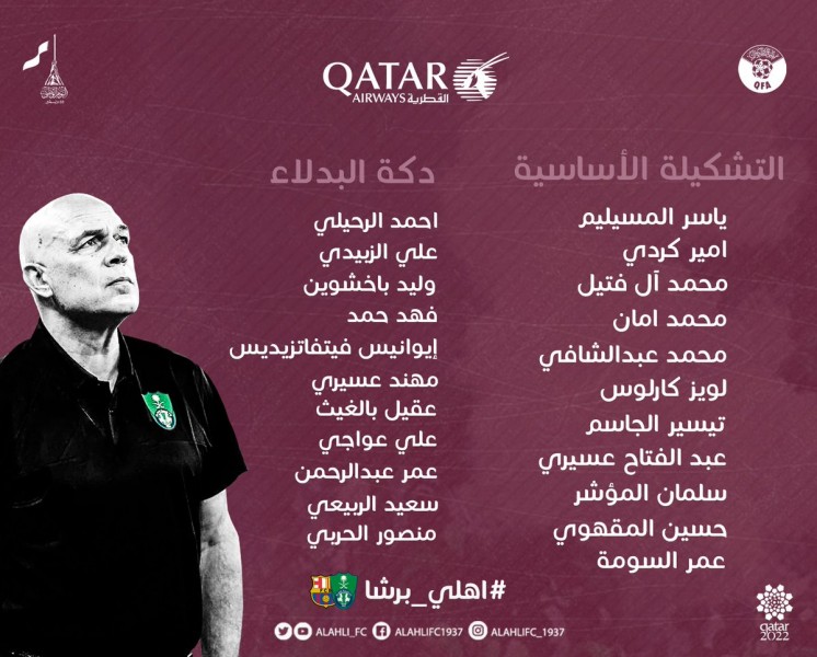 تواجد الدولى المصرى محمد عبد الشافى فى التشكيل الأساسى لفريق أهلى جدة السعودى، خلال المواجهة التاريخية التى تجمعه بعد قليل مع نظيره برشلونة الإسبانى، بالعاصمة القطرية الدوحة، والتى تقام فى تمام السادسة بتوقيت القاهرة.