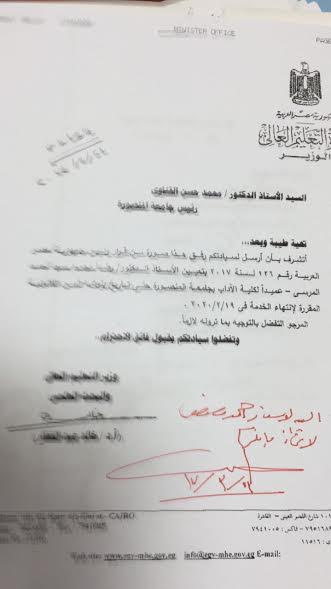 أرسل د .خالد عبد الغفار وزير التعليم العالى والبحث العلمى خطاب الى د .محمد القناوى رئيس جامعة المنصورة بقرار السيد رئيس الجمهورية رقم 126لسنة 2017 م بتعيين د. رضا سيد أحمد عميدا لكلية الآداب بجامعة المنصورة حتى تاريخ انتها الفترة القانونية المقررة لانتهاء الخدمة .
