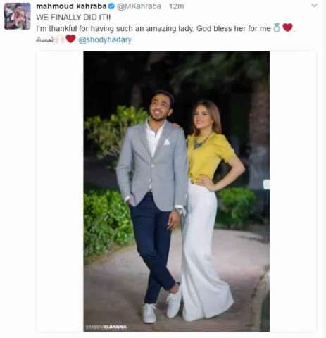 حرص محمود كهربا، على مشاركة صورته مع خطيبته شدوى الحضرى، عبر حسابه على موقع التدوينات القصيرة تويتر، وعلق قائلاً: " أنا ممتن لوجود تلك المرأة فى حياتى، بارك الله لى فيها".