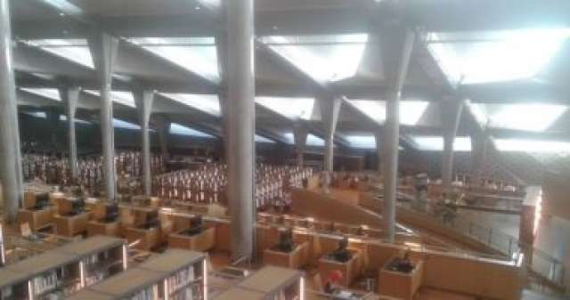 وتفقد الرئيس السيسى مكتبة الإسكندرية، واستمع لشرح تفصيلى عن المكتبة، وما تحويه من أقسام وكتب، كما أجرى جولة فى متحف المخطوطات وقاعات المكتبة.