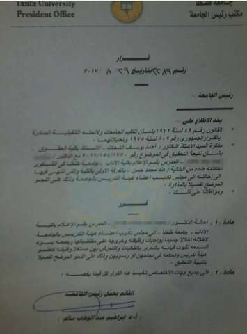 قرر الدكتور ابراهيم سالم، القائم بأعمال رئيس جامعة طنطا، إحالة أستاذ بقسم الإعلام فى كلية الاداب، الى مجلس التأديب لتغريره بالطالبات والتحرش بهن عبر وسائل التواصل الإجتماعي وثبوت ذلك بمحاضر رسمية حررتها الطالبات ضده.