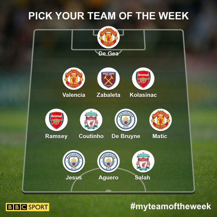 وشهدت القائمة تواجد 3 لاعبين من مانشستر سيتي، ولاعب واحد من أرسنال، بالإضافة الى لاعبين من أندية مانشستر يونايتد، ساوثامبتون، نيوكاسل، وبيرنلي ضمن قائمة الأندية التي شهدت دخول لاعبيها في القائمة المثالية للجولة.