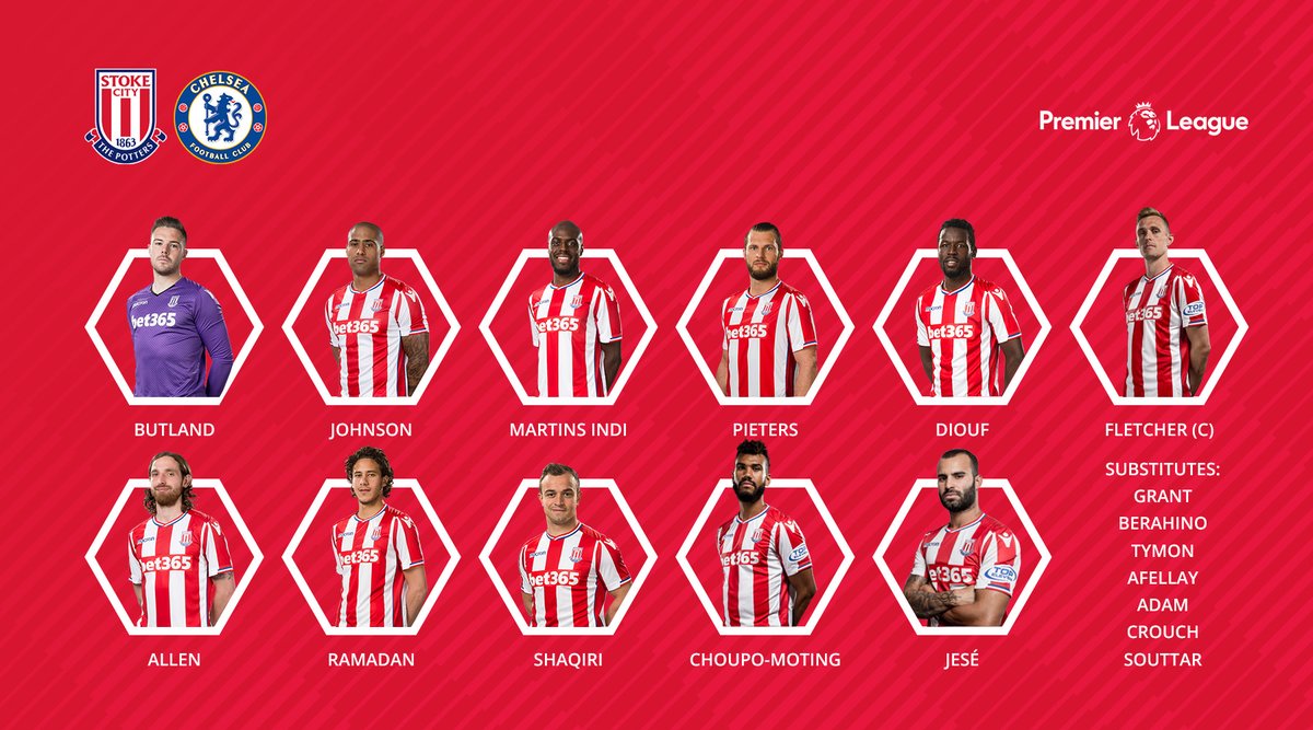 تشكيلة ستوك سيتى ضمت كلاً من: بوتلاند؛ جونسون، إندى، بيتيرس؛ ضيوف، فليتشر، ألين، رمضان صبحى؛ خيسى، شاكيرى؛ تشوبو موتينج.