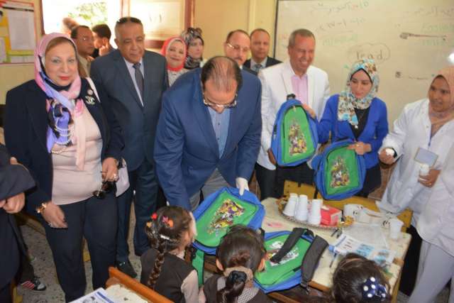محافظ الدقهلية يوزع 800 شنطة مدرسية على تلاميذ مدرستي عادل المليجى والشهيد جميل طرباي الابتدائية بسندوب