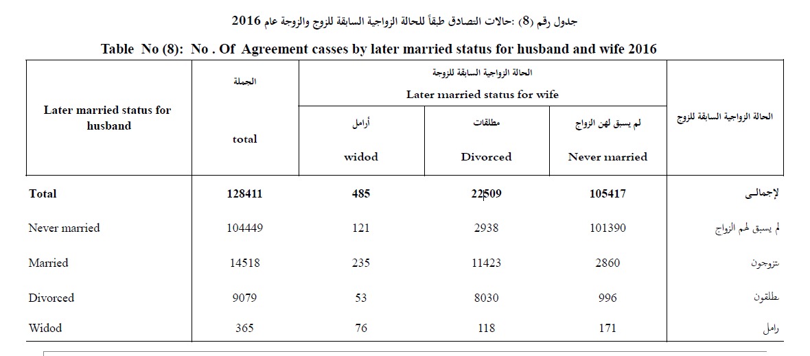 وأضافت النشرة الإحصائية أن 996 فتاة من اللآتى لم يسبق لهن زواج، تزوجن من رجال مطلقة خلال عام 2016، و171 تزوجن من أرامل، فيما أشارت النشرة إلى أن 2938 مطلقة من إجمالى عدد المطلقات "22.5 ألف مطلقة" اللآتى تزوجن للمرة الثانية خلال العام الماضى، تزوجن من رجال لم يسبق لهم زواج.