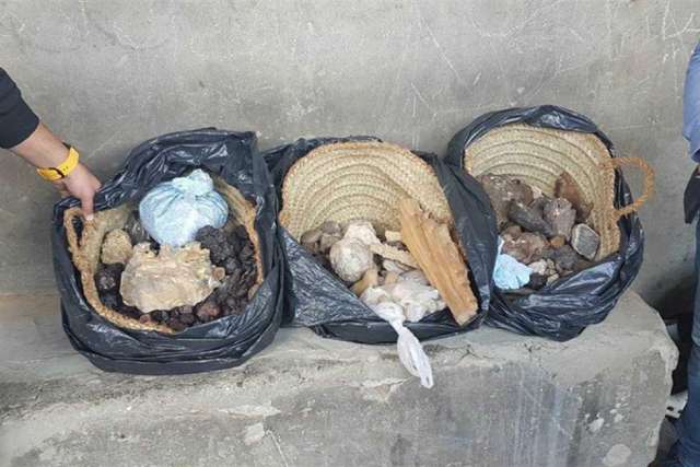 تبين للجنة وجود ٨٨ كيلو جراما أحجارا وصخورا متنوعة ومختلفة الأحجام والأشكال اشتبهت اللجنة في كونها ذات قيمة تاريخية وعلمية وأصناف أخرى من الصناعات اليدوية المتنوعة من منتجات خان الخليلي يشتبه في أثريتها.