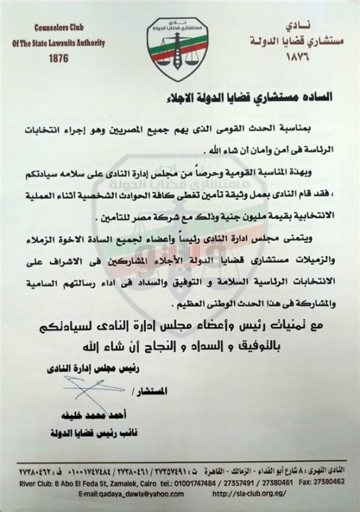 قرر نادي هيئة قضايا الدولة، برئاسة المستشار أحمد خليفة، التأمين على أعضائه المشرفين على الانتخابات الرئاسية، بمبلغ مليون جنيه لكل عضو تصرف لأسرته في حالة وفاته، و750 ألف جنيه في حالة إصابته بعجز كلي.