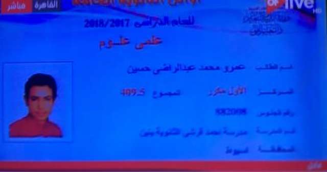 حصل الطالب عمرو محمد عبدالراضى حسين، علي المركز الأول مكرر في الشهادة الثانوية العامة "علمي علوم" بمدرسة أحمد قرشي الثانوية بمركز ديروط بأسيوط .