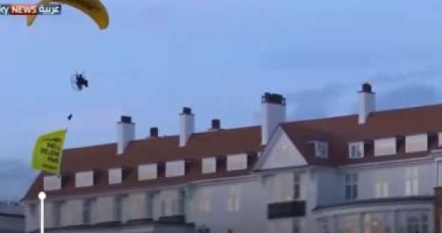 وبحسب موقع فضائية "سكاى نيوز"حمل المظلى لافتة احتجاج كتب عليها: "ترامب دون المستوى"، مساء أمس الجمعة، وقال ستيفن مكولوتش، من الشرطة، إن المتظاهر اخترق منطقة الحظر الجوى فوق فندق تيرنبيرى وارتكب جريمة جنائية.