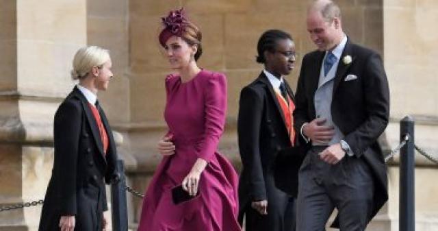 كيت ميدلتون التي اختارت فستاناً أنيقاً من أليكسندر مكوين، وهى نفس الاطلالة التى ارتدتها فى زفافها، وبدت متأنقة فى اللون الأرجوانى، وتساير الموضة بشنطة صغيرة الحجم وحذاء من الكعب العالى من القطيفة وهو نفس خامة الشنطة، أما الشابوه فكان خليطا من خامة الستان على شكل ورد وخامة الدانتيل التى تدلت على جزء من وجهها.