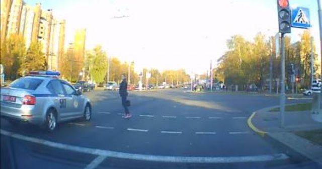 سجلت كاميرا معلقة على إحدى السيارات فى بيلاروسيا، فتاة تحاول قطع الطريق على الممر المخصص للمشاة بعد ظهور الضوء الأخضر أمامها، الذى تزامن مع مرور الموكب الرئاسى البيلاروسى فى ذات الطريق التى تعبر منه.