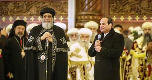 هنأ الرئيس عبد الفتاح السيسيى البابا تواضرس بابا السكندريه و بطريارك الكرازه المرقسيه بعيد الميلاد المجيد حيث قام بافتتاح كاتدرائية ميلاد المسيح بالعاصمة الاداريه الجد يده وفى بدايه كلمته رحب الرئيس السيسي بالرئيس الفلسطنيى أبو مازن والضيوف الأشقاء من الدول العربيه والصديقه وقال الرئيس إنها لحظه تاريخيه وقدم التحيه للشهداء المصريين من أ الجيش والشرطة والمدنيين مؤكد إن هذه اللحظه مهمه فى تاريخ مصر مشيرا لزيارته للكتدرائيه العباسيه منذ عامين حيث أكد وقتها أم إفتتاح كاتدرائية الجديده ستكون فى عامين وهذا ما تم واحتفالا اليوم كاملا بأنتهاء بناء و إفتتاح الكاتدرائيه والمسجد وأضاف الرئيس أن المعنى المقصود هنا اننا لن نسمح لحد أن يؤثر ولن أقول فتنه طائفيه( لأننا مش كده إحنا واحد) وقال الرئيس هى شجره المحبه التى غرزناها مع بعض ولسه الشجره دى عاوزه مننا نحافظ عليها وحولها من مصر للعالم كله ونكون دى رسالتنا للعالم رساله محبه مشددا إلى أن الفتن لن تنتهى وإن الله سبحانه وتعالى حافظ مصر وهو أللى حايحفظها لأهلها ثم كرر الرئيس نقوله إن الفتن لن تنتهى وطالب المصريين باليقظه والحرص وقال لبابا تواضرس فى عام 2013 تم الاعتداء على الكنائس وقتها قال قداسه البابا مقوله لن أنساها ( وطن بلا كنائس خير كنائس بلاوطن) مؤكد إن هذه المقوله كانت تعكس مع انى كبيره ومعناها إذا حافظنا على أوطاننا سمحنى كثيرا وقال الرئيس إحنا بنبنى مدن جديده بها مدارس وكنائس ومساجد.. (عنينا على بلدنا ونخلى بلنا بينا وما تنسوش تخلوا بالكم من بلدكم وفى ختام كلمته أعاد الرئيس تهنئته للاخوه المسحيين كل عام وانتم طيبين وفى محبه وقدم التهنئه للبابا تواضرس