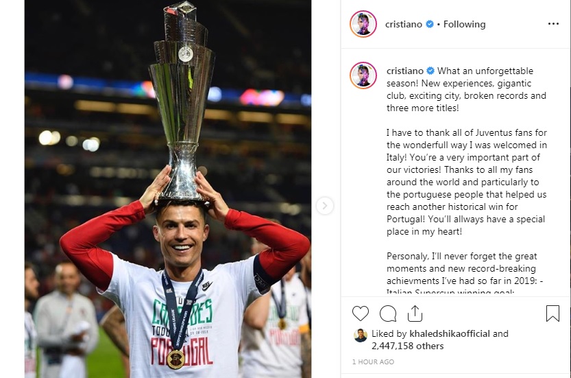 وكتب النجم البرتغالى كريستيانو رونالدو مهاجم يوفنتوس عبر حسابه الشخصى بموقع التواصل الإجتماعى "إنستجرام" قائلا:"يا له من موسم لا ينسى، تجارب جديدة، نادى كبير، مدينة مثيرة، سجلات جديدة و 3 ألقاب".