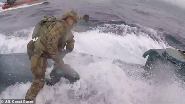 أشاد الرئيس الامريكي دونالد ترامب، بمجهود قوات خفر السواحل التابعة للجيش الأمريكي، بعد أن كشفت لقطات مصورة لهم، وهم يقفزون على غواصة متحركة في المحيط الهادي لمنع تجار المخدرات من نقل الكوكايين، إلى الولايات المتحدة.