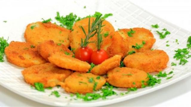 - اغمسي اقراص البطاطس في الدقيق ثم البيض ثم البقسماط