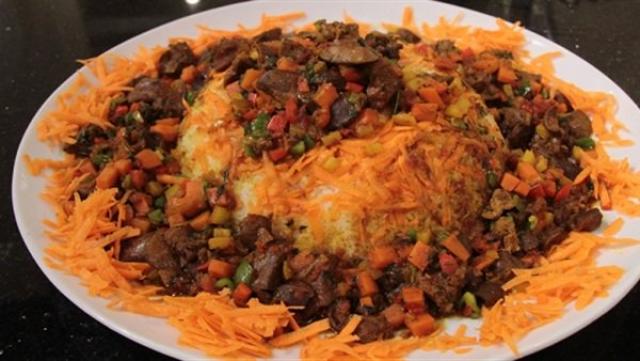 * يقدم على شكل طبقات طبقة من الارز وطبقة من الكبد والقوانص وصوص الجزر ويقدم
