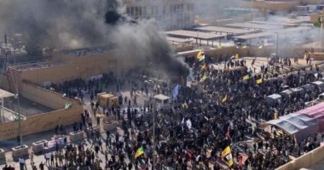 كان المحتجون بمحيط حرم السفارة قاموا بحرق عدد من البوابات ومراكز الحراسات للسفارة الأمريكية فى المنطقة الخضراء وسط بغداد، حيث وصل زعيما ميليشيا عصائب أهل الحق قيس الخزعلى، وزعيم ميليشيا بدر هادى العامرى أمام السفارة ونصب مناصرو "حزب الله العراق" خيام الاعتصام أمام مبنى السفارة، كما رفع المحتجون شعارات مطالبة بإغلاق السفارة وطرد السفير.