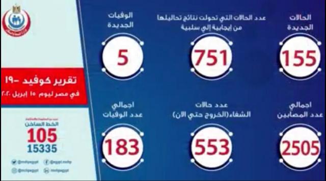 وقالت الوزارت إن جميع الحالات المسجل إيجابيتها للفيروس بمستشفيات العزل تخضع للرعاية الطبية، وفقًا لإرشادات منظمة الصحة العالمية، لافتة إلى أن إجمالي العدد الذي تم تسجيله في مصر بفيروس كورونا المستجد حتى اليوم الأربعاء، هو 2505 حالات من ضمنهم 553 حالة تم شفاؤها وخرجت من مستشفيات العزل، و183 حالة وفاة.