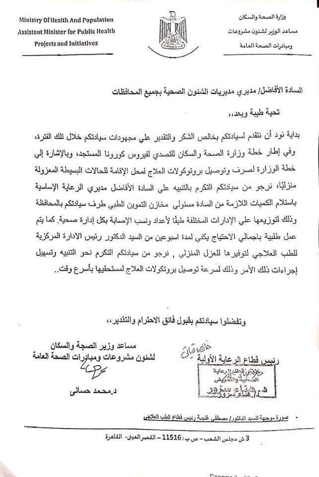 خاطب الدكتور محمد حساني مساعد وزيرة الصحة لشؤون المبادرات العامة مديري مديريات الشؤون الصحية بجميع المحافظات وذلك لصرف علاج مرضى فيروس كورونا من خلال المراكز الطبية التابعة لمحل الإقامة.