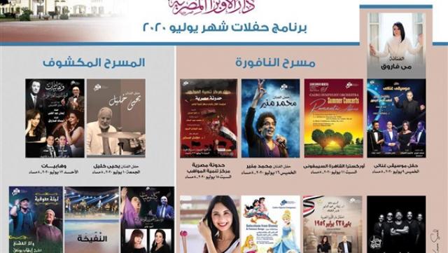 أعلنت دار الاوبرا المصريه برئاسة الدكتور مجدى صابر، عن فتح شباك الحجز الالكترونى لعروض شهر يوليو على مسارحها بالقاهرة والاسكندرية ( النافورة – المكشوف – سيد درويش بالاسكندرية ) والتى تقام تحت اشراف الدكتور خالد داغر رئيس البيت الفنى للموسيقى والاوبرا والباليه طبقا للاجراءات الاحترازية حرصا على سلامة الجمهور والفنانين والعاملين وتنطلق فى الثامنة مساء الخميس 10 يوليو على مسرح النافورة بسهرة طربية لنجوم فرق الموسيقى العربية بالاوبرا .