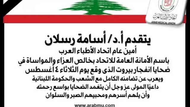 أعرب اتحاد الأطباء العرب على لسان أمينه العام الأستاذ الدكتور أسامة رسلان عن تضامنه الكامل مع لبنان حكومة وشعبًا، في محنته الحالية، بعد الانفجار الضخم الذي هز العاصمة اللبنانية بيروت، أمس الثلاثاء ، وأسفر عن أضرار مادية فادحة فضلا عن عشرات القتلى، و مئات المصابين،