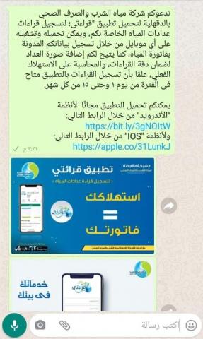 أرسلت شركة مياه الشرب والصرف الصحي بالدقهلية؛ رسائل للعملاء لتعريفهم بأهمية تطبيق قراءتي، وكيفية استخدامه، وتحميله، وذلك من خلال رقم الخط الساخن على تطبيق واتس آب، ويأتي ذلك ضمن الحملة المكثفة التي تقوم بها الشركة، للتعريف بالتطبيق لدى أكبر عدد من العملاء داخل المحافظة، ويذكر أن تطبيق قراءتي قد أصدرته الشركة القابضة لمياه الشرب والصرف الصحي؛ لتسجيل قراءات عدادات المياه، ويمكن تحميله وتشغيله على أي موبايل من خلال تسجيل البيانات المدونة بفاتورة المياه، كما يتيح إضافة صورة العداد لضمان دقة القراءات، والمحاسبة على الاستهلاك الفعلي، وتسجيل القراءات بالتطبيق متاح فى الفترة من يوم ١ وحتى ١٥ من كل شهر.