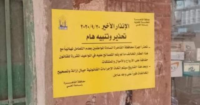 وحذر حى السيدة زينب المواطنين من التعامل مع العقارات المخالفة التى لم يتقدم أصحابها للتصالح على مخالفات البناء، وذلك من خلال وضع ملصق يحذر من التعامل مع هذه العقارات، كتب عليه "التحذير الأخير".