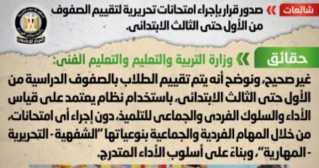 كشف المركز الاعلامى لمجلس الوزراء إنه فى ضوء ما تردد من أنباء بشأن صدور قرار بإجراء امتحانات تحريرية لتقييم الصفوف من الأول حتى الثالث الابتدائي، تواصل المركز مع وزارة التربية والتعليم والتعليم الفني، والتي نفت تلك الأنباء، مُؤكدةً أنه لا صحة لصدور قرار بإجراء امتحانات تحريرية لتقييم الصفوف من الأول حتى الثالث الابتدائي، مُوضحةً أنه يتم تقييم الطلاب بالصفوف الدراسية من الأول حتى الثالث الابتدائي، باستخدام نظام يعتمد على قياس الأداء والسلوك الفردي والجماعي للتلميذ، دون إجراء أي امتحانات، من خلال المهام الفردية والجماعية بنوعياتها "الشفهية - التحريرية - المهارية"، وبناءً على أسلوب الأداء المتدرج.