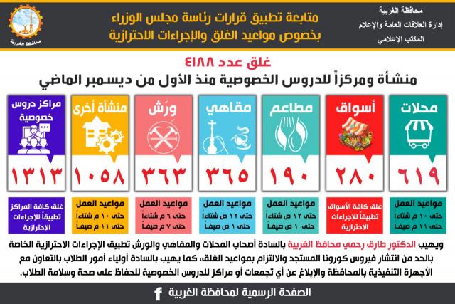 تابع الدكتور طارق رحمي محافظ الغربية تنفيذ قرار وزير التنمية المحلية والخاص بمواعيد الغلق الجديدة، حيث تم غلق عدد (٦١٩) محل، عدد (٢٨٠) سوق، عدد (١٩٠) مطعم، عدد (٣٦٥) مقهى، عدد (٣٦٣) ورشة و (١٠٥٨) منشأة أخرى بنطاق محافظة الغربية بإجمالي عدد ٢٨٧٥ منشأة مخالفة لمواعيد الغلق وذلك حرصاً على تنفيذ الإجراءات الاحترازية الخاصة بالحد من انتشار فيروس كورونا المستجد.