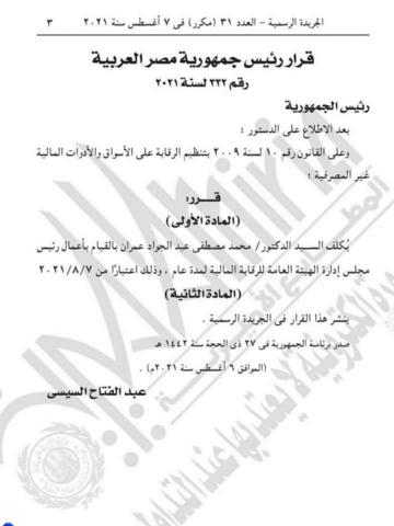 نشرت الجريدة الرسمية في العدد رقم 31 "مكرر"، بتاريخ 7 أغسطس 2021، قرار رئيس الجمهورية رقم 332 لسنة 2020، بشأن تكليف الدكتور محمد مصطفى عبد الجواد عمران بالقيام بأعمال رئيس مجلس إدارة الهيئة العامة للرقابة المالية لمدة عام، وذلك اعتبارا من 7-8-2021.