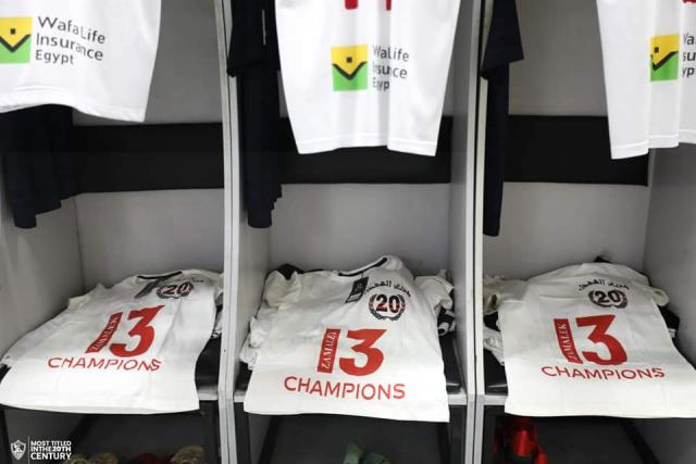 يرتدي الفريق الأول لكرة القدم بنادي الزمالك قميصا خاصا للاحتفال ببطولة الدوري المصري الممتاز خلال فترة الإحماء التي تسبق مواجهة البنك الأهلي في الجولة الأخيرة من المسابقة.