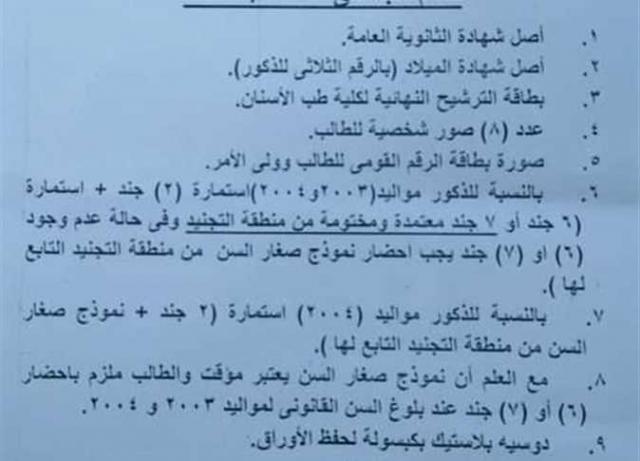 أعلن الدكتور ياسر فتحي، عميد كلية طب الأسنان، الأوراق المطلوبة من الطلاب المرشحين للقبول بالكلية، للعام الجامعي 2021-2022، وهي 9 مطالب عبارة عن أصل الشهادة الثانوية، أصل شهادة الميلاد «الرقم القومي»، بطاقة الترشح النهائية لكلية الأسنان، وعدد 8 صور شخصية للطالب، صورة بطاقة الرقم القومي للطالب وولي الأمر، والموقف من التجنيد للذكور، ودوسيه بلاستك.