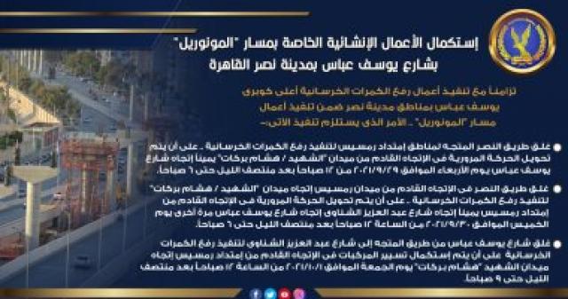 ومن جانبها، تقوم الإدارة العامة لمرور القاهرة بالتنسيق مع الشركة المنفذة لوضع المساعدات الفنية وجميع التجهيزات الدالة على وجود أعمال بالمنطقة لضمان أمن وسلامة المواطنين.