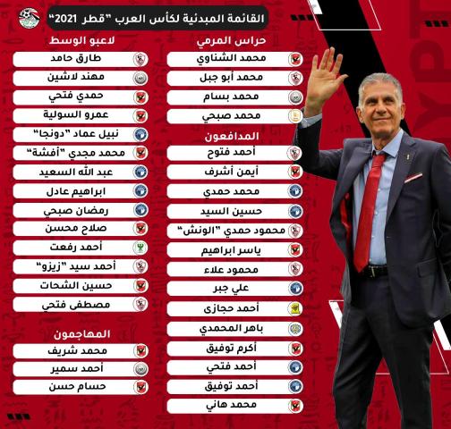 أرسل أمس الجهاز الفني للمنتخب الوطني بقيادة كارلوس كيروش المدير الفني القائمة المبدئية للاعبين إلى الاتحاد العربي لكرة القدم والذي سيتم اختيار القائمة النهائية من بينها .. وكان الاتحاد العربي قد حدد أول أكتوبر الحالي موعدًا أخيرا للفرق المشاركة في كأس العرب التي تستضيفها الدوحة في ديسمبر المقبل ، وذلك لإرسال قوائمها المبدئية التي تضم 35 لاعبًا.. وجاءت قائمة مصر على النحو التالي: