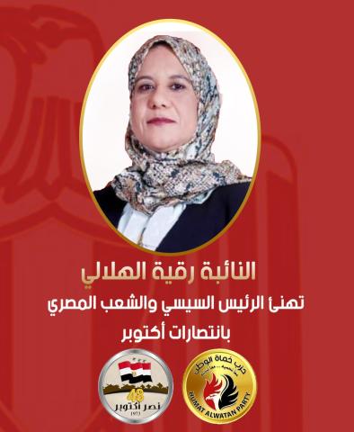 هنأت النائبة رقية عبد العزيز الهلالي، عضو لجنة الأسكان بمجلس النواب عن حزب حماة الوطن، الرئيس عبد الفتاح السيسي رئيس الجمهورية القائد الأعلى للقوات المسلحة، والشعب المصري العظيم، والفريق أول محمد أحمد زكي، القائد العام للقوات المسلحة، وزير الدفاع والإنتاج الحربيّ، وضباط وجنود وصف القوات المسلحة المصرية، بمناسبـة الأحتفال بالذكرى الـ 48 لانتصارات أكتوبر المجيدة.