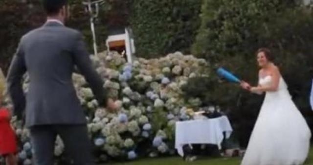 ووثق شريط فيديو لحظة رمي العريس لكرة البيسبول نحو عروسه، التي كانت ترتدي فستانها الأبيض وتحمل مضربا.
