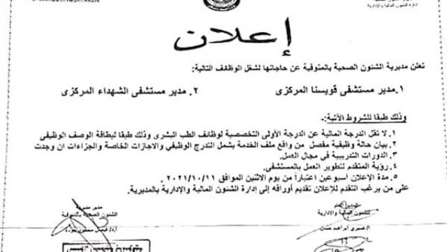 أعلنت مديرية الصحة في محافظة المنوفية، عن حاجتها لشغل وظيفة مدير مستشفى قويسنا المركزي ومدير مستشفى الشهداء المركزي.