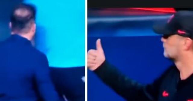 وتوجه كلوب لمصافحة سيميونى عقب نهاية المباراة ، لكن مدرب أتلتيكو مدريد ظهر يركض لغرفة الملابس دون أن يتوجه لمصافحة المدرب الألماني وهو ما أظهر الضيق على وجه الأخير.