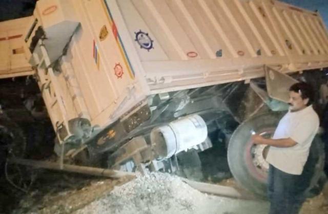 بالفحص، تبين انقلاب سيارة نقل بمقطورة بالطريق المشار إليه إثر إصدامها في عمود إنارة وعدد من البلدورات.