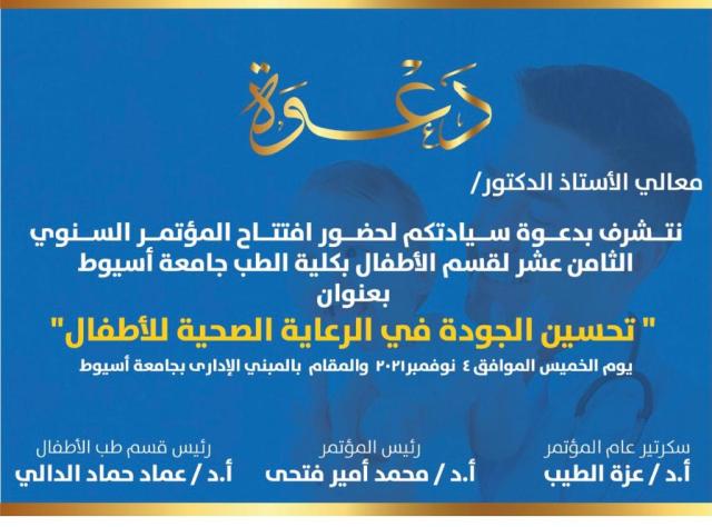 تشهد جامعة أسيوط غداً الخميس 4 من نوفمبر الجاري وقائع افتتاح المؤتمر السنوي الثامن عشر لقسم الأطفال بكلية الطب بالجامعة تحت عنوان " تحسين الجودة في الرعاية الصحية للأطفال " بحضور الدكتور طارق الجمال رئيس الجامعة وذلك بمشاركة السادة نواب رئيس الجامعة والدكتور علاء عطية عميد كلية الطب ورئيس مجلس إدارة المستشفيات الجامعية ،والدكتور إيهاب فوزي المدير التنفيذي للمستشفيات الجامعية , والدكتور عماد حماد الدالي رئيس قسم طب الأطفال , والدكتور محمد أمير فتحي أستاذ طب الأطفال ورئيس المؤتمر , والدكتورة عزة الطيب أستاذ الأطفال وسكرتير عام المؤتمر .