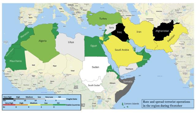 وفي السياق ذاته؛ فقد أشار "الوطني للدراسات" إلى اتساع النطاق الجغرافي للهجمات الإرهابية بالدول التي يصفها المؤشر بالمستقرة (عددها 21 دولة من بين 29 دولة يقوم المؤشر بمتابعتها)، حيث طالت الهجمات الإرهابية خلال شهر أكتوبر 7 دول هي: السعودية وباكستان وإيران واسرائيل وتركيا ومصر والجزائر، في مقابل 4 دول فقط تعرضت لمثل هذه الهجمات خلال شهر سبتمبر؛ وهي باكستان والسعودية ومصر وإيران، وهو ما أرجعه المؤشر إلى احتدام أزمات وصراعات إقليمية بعينها؛ وعلى رأسها الأزمة اليمنية والصراع المكتوم بين إيران واسرائيل.