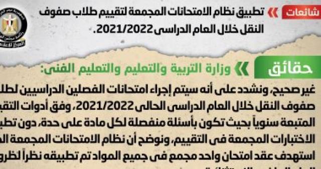 كشف المركز الإعلامى لمجلس الوزراء أنه فى ضوء ما تردد من أنباء بشأن تطبيق نظام الامتحانات المجمعة لتقييم طلاب صفوف النقل خلال العام الدراسي 2021/2022، تواصل المركز مع وزارة التربية والتعليم والتعليم الفني، والتي نفت تلك الأنباء، مُؤكدةً أنه لا صحة لتطبيق نظام الامتحانات المجمعة لتقييم طلاب صفوف النقل خلال العام الدراسي 2021/2022، مُشددةً على أنه سيتم إجراء امتحانات الفصليين الدراسيين لطلاب صفوف النقل خلال العام الدراسي الحالي 2021/2022، وفق أدوات التقييم المتبعة سنوياً بحيث تكون بأسئلة منفصلة لكل مادة على حدة، دون تطبيق الاختبارات المجمعة في التقييم، مُوضحةً أن نظام الامتحانات المجمعة الذي استهدف عقد امتحان واحد مجمع في جميع المواد تم تطبيقه نظراً لظروف العام الماضي الاستثنائية.