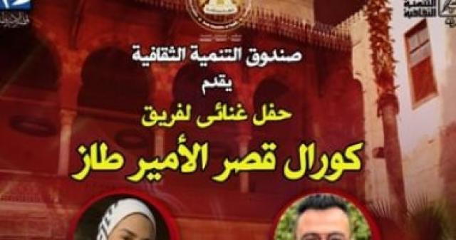 يقيم مركز إبداع قصر الأمير طاز بحى الخليفة التابع لقطاع صندوق التنمية الثقافية، فى السابعة مساء الخميس المقبل، حفل كورال قصر الأمير طاز ويحمل عنوان "من فات قديمه تاه".