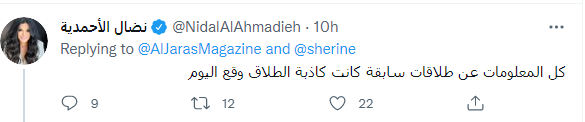 وتابعت نضال الأحمدية على حسابها الشخصي بـ تويتر: شيرين طلقت حسام حبيب، كل المعلومات عن طلاقات سابقة كانت كاذبة.. الطلاق وقع اليوم.